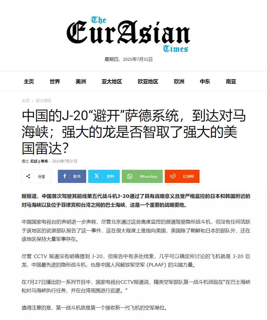 根据《欧亚时报》7月31日的报道,中国国家电视台(CCTV)曾报道过歼-20飞越对马海峡的新闻。该海峡,作为全球防空最密集的区域之一,拥有多个先进的雷达和防空系统。然而,歼-20的飞行却丝毫没有引起任何反响,反而让印媒认为中国此举是在“羞辱”韩国、日本以及美国,尤其是在美国与其他18个国家近期联合进行的太平洋大规模军演之后,这一举动显得尤为不合时宜,并且极具挑衅意味。